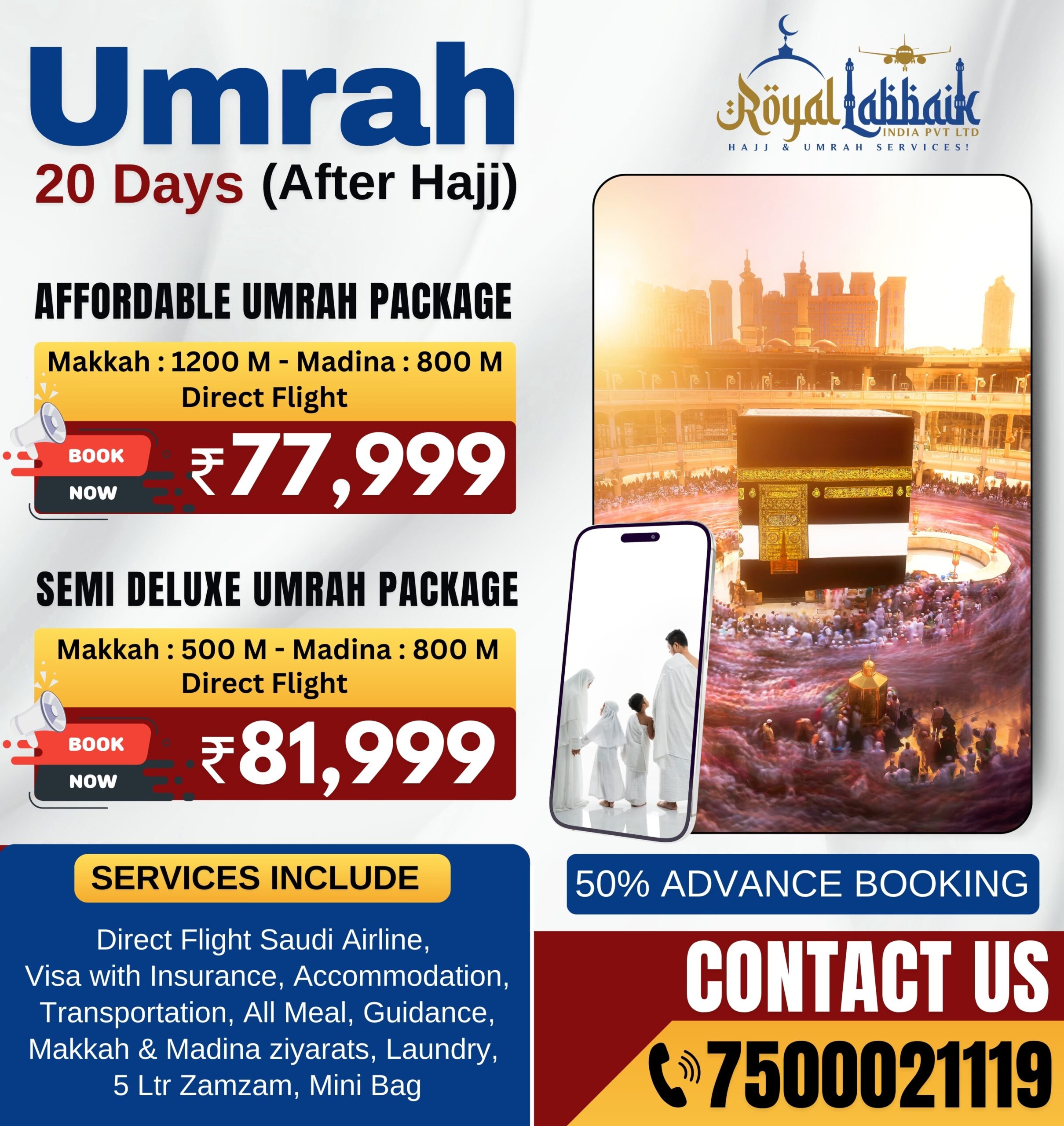 Our unforgettable Umrah holds these popular Umrah packages close to their hearts. Lovingly crafted with compassion. We offer a variety of options including the Budget Umrah Package. Economy Umrah Package. Semi-deluxe Umrah Package. And Long Stay Umrah Package. Each package is designed to make the spiritual journey as smooth as possible for our valued customers. Our mission is to ensure that this important journey becomes a precious memory for all. While also offering the best Umrah package and convenient Umrah packages from India. Making it affordable for everyone